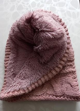 Красивый теплий снуд розово пудрового цвета объёмной вязки, срединка типа искусственного мягенького меха. Ширина 42, высота 26. Бирка с составом срезана. Практичен и удобен в носке и уходе.