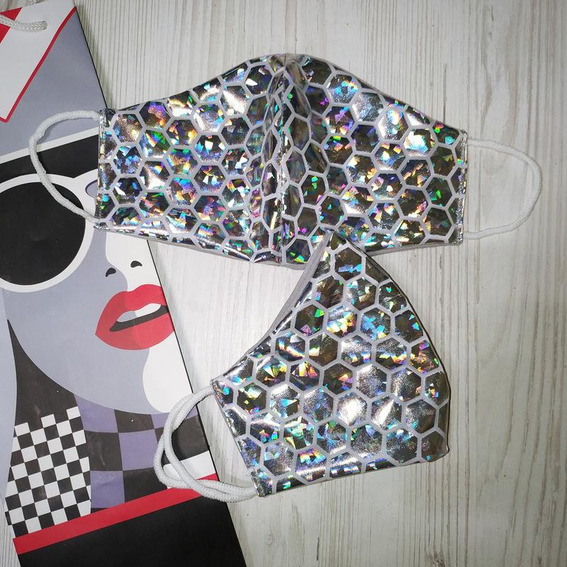 Двошарові багаторазові масочку - голограма. Красиво переливаються і відблискують. Верхній шар трикотаж, внутрішній - натуральний бавовна приємний до тіла.
