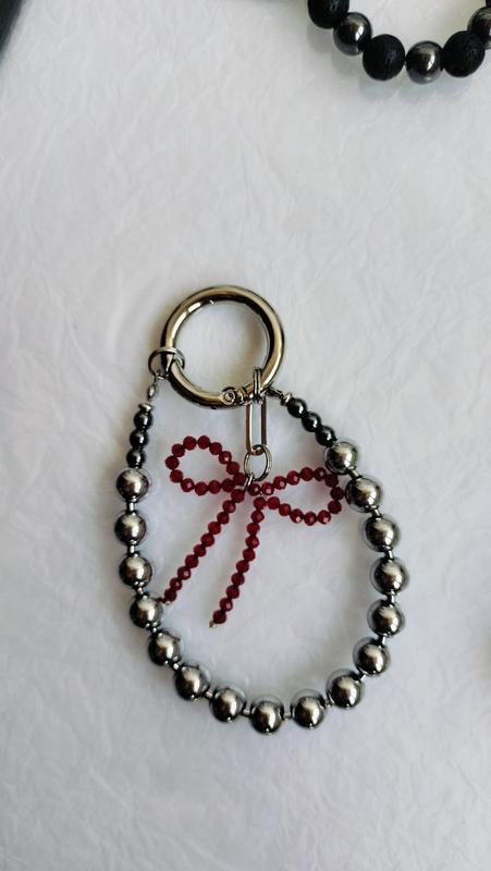 Брелок из гематита на круглом карабине с бантиком, минималистичнр и стильно. я Для сумки, ключей. Упаковка подарочная, можно сразу же дарить