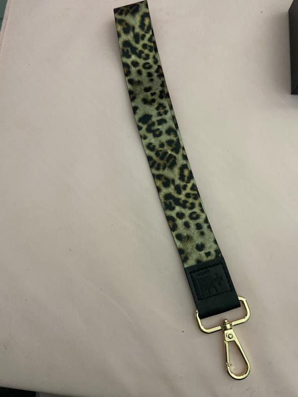 ремінець із леопардовим принтом від бренду MARCCAIN. Ремінець може використовуватися як ремінець для зап'ястя або тримач для ключів/карток, завдяки своїй конструкції.Він виконаний у трендовому леопардовому стилі (анімалістичний принт). Ремінець виготовлений з тканини (й поліестер) та оснащений металевим карабіном золотистого кольору для легкого кріплення до інших предметів.На чорній вставці тиснений логотип бренду Новий в упаковці