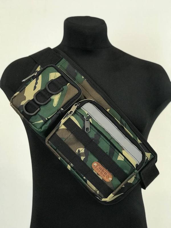 Особливості. Тактична сумка виконана з "оксфорда", який є тканиною, що володіє міцністю і надійністю. Завдяки спеціальному просоченню тканина відштовхує вологу. Розміри: Розмір сумки 40×18см довжина основного відділення 29×14 Передня велика кишеня 18×13×4см Маленька кишеня 10×12×4 Має світловідбиваючу стрічку У сумці можна носити телефони, ручки, ключі, гаманець, документи, навушники та інше.