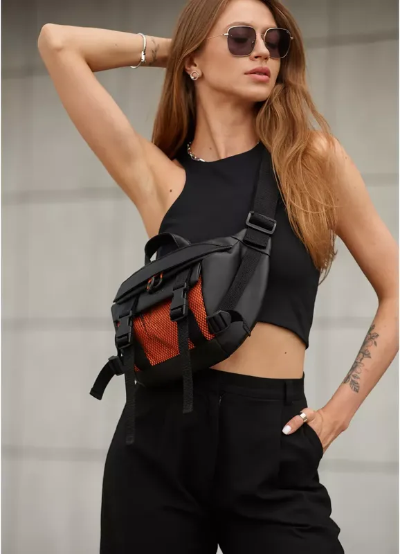 Сумка бананка Sambag DynamicDart - скорость, движение и целеустремленность Сумка на 9 отделений сочетает удобство, емкость и практичность. Характеристики: • Материал верха: новейшая экокожа повышенного уровня износостойкости (не менее 50 000 циклов по тесту Мертингейла). Кожа водоотталкивающая, устойчивая к выцветанию, эластичная (не трескается при эксплуатации) и прочная на разрыв. • Подкладка: материал оксфорд средней плотности, прочный, устойчивый кцарапин, легко чистится, нитки не выползнут. Благодаря соединению всех частей подкладки между собой, нагрузка на экокоже уменьшаются и равномерно распределяются. Это продлевает срок службы кожи и швов извне. • Фурнитура: молнии типа YKK из надежного пластика. Бегунки с фиксатором: сумка не откроется самостоятельно от нагрузок, а только рукой. Основное отделение на молнии. Фастекс-застежки из прочного современного пластика известного производителя WT. • Подтяжки. Плечевой ремень из текстиля надежно пришит к кожаным окончаниям. Длина регулируется с помощью фастекса и пластикового регулятора. • Функциональность: снаружи спереди карман из сетки. Внутри сумки помимо основного отделения есть два открытых кармана, один большой карман на молнии, в котором три открытых отделения. Снаружи на спинке сумки два открытых кармана, куда легко поместится телефон и другие мелочи. Стандартный обхват (сумка с ремнем) составляет от 86 см до 168 см: длина регулируется. При заказе в комментарии указать необходимую длину ремня, если она отличается от стандартной. • Размер: 38*21 см, максимальная ширина верха 7 см, книзу сужается.