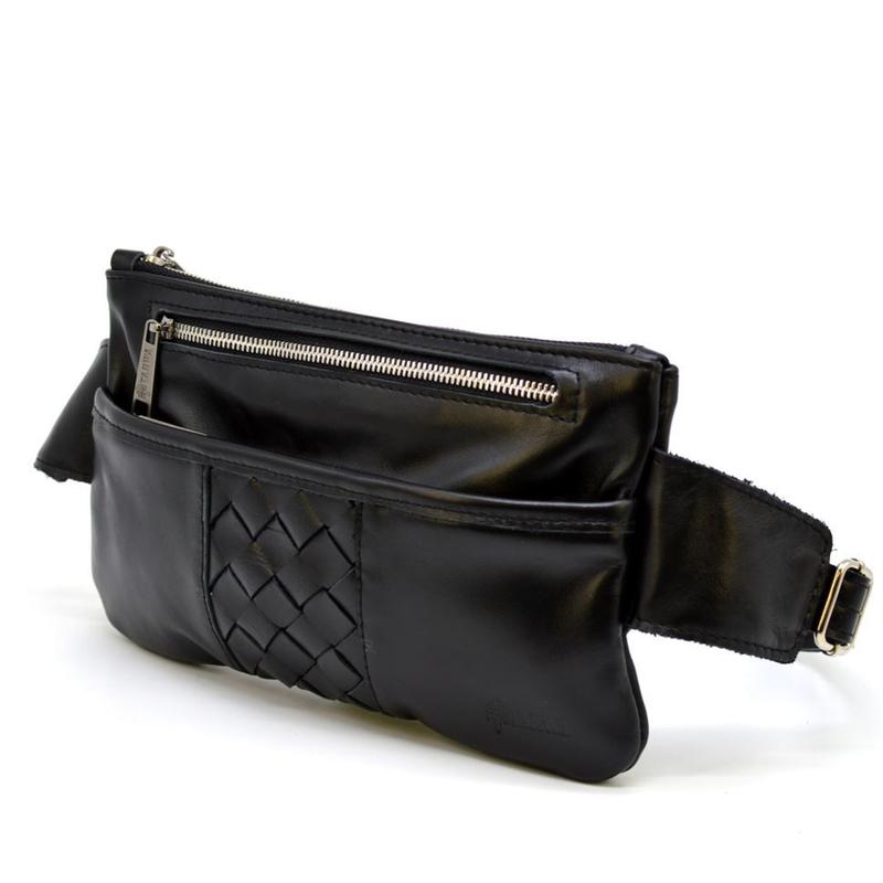 Напоясная сумка из натуральной кожи GA-8034-4lx TARWA с плетением из натуральной кожи изготовлена из гладкой телячьей кожи в черном цвете. Современная и удобная модель, подходит как мужчинам, так и девушкам. Одно отделение застегивается на металлическую молнию. Внутри - небольшой карман с молнией. Лицевая часть оснащена узким карманом на всю длину сумки и застегивается на молнию. Спереди еще есть дополнительный врезной карман, также на молнии. Тыльную сторону изделия дополняет карман на молнии. Регулируемый ремень на текстильной основе застегивается на прочную застежку (фастекс). Металлическая фурнитура надежная и крепкая.