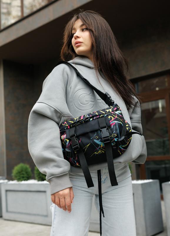 Поясная сумка бананка трансформер на 9 отделений сочетает в себе удобство, вместительность и практичность. Модель обладает способностью соединяться с рюкзаком с принтом ABSTRACT. Поясная сумка воплощает практичность и целеустремленность. Характеристики женской бананки DynamicDart для путешествий Материал верха: полиэстр повышенного уровня износостойкости (не менее 50 000 циклов по тесту Мертиндейла). Материал водоотталкивающий, устойчивая к выцветанию, эластичная (не трескается при эксплуатации) и прочная на разрыв. Подкладка: материал оксфорд средней плотности, прочный, устойчивый к царапинам, легко чистится, нитки из него не выползают. Благодаря соединению всех частей подкладки между собой, нагрузка на экокожу уменьшается и распределятся равномерно. Это продлевает срок службы кожи и швов извне. Фурнитура: молнии типа YKK из надежного пластика. Бегунки металлические с фиксатором: сумка не откроется самостоятельно от нагрузок, а только рукой. Основное отделение на молнии. Фастекс-застежки из прочного современного пластика известного производителя WT. Шлейки: плечевой ремень из текстиля надежно пришит к тканвым окончаниям. Длина регулируется с помощью фастекса и пластикового регулятора. Функциональность: снаружи спереди сумки карман из сетки. Внутри сумки, кроме основного отделения, есть два открытых кармана, один большой карман на молнии, в котором три открытых отделения. Снаружи на спинке сумки два открытых кармана, куда легко поместится телефон и другие мелочи. Стандартный обхват (сумка с ремнем) составляет от 86 см до 168 см (длина регулируется). При заказе в комментарии задайте необходимую длину ремня, если она отличается от стандартной. Размер: 38*21 см, максимальная ширина верха 7 см, к низу сужается.
