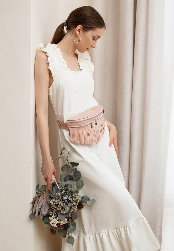 Поясна сумка Spirit з натуральної шкіри в бежевому кольорі відображає в собі дух волелюбних хіппі, містичну силу індіанців і бунтарські настрої мілленіалов. Саме ці стилі і епохи надихнули нас на створення такої сумки. Сумка ручної роботи пошита з натуральної шкіри краст. Цей вид шкіри відрізняється своєю гладкою поверхнею. Такий аксесуар підкреслить всю свободу і натуральність стилю бохо. Поясна сумка Spirit не тільки дуже гарна, але і зручна. У неї помістяться всі необхідні дрібниці, такі як ключі, телефон, гаманець, але при цьому руки залишаться вільними. Внутрішнє відділення закривається на міцну якісну блискавку. Також на блискавки закриваються дві передніх кишені і одна кишеня на задній стінці. Прикрашена сумка бахромою, а пуллер на блискавках виконаний у вигляді дуже милих ажурних листочків. Завдяки регульованому ремінцю сумку зручно носити як на поясі або стегнах, так і за спиною або на грудях. А ніжний бежевий колір чудово підійде для літніх образів. Такий аксесуар стане фаворитом у любительок комфорту і якості. Фурнітура та комплектація може бути змінена виробником
