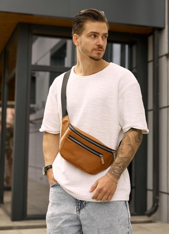 Большая мужская кожаная сумка на пояс бананка sambag tirso max рыжая
