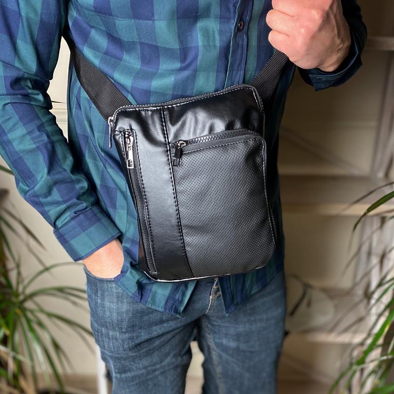 Мужская сумка через плечо планшетка на 5 отделений черная экокожа