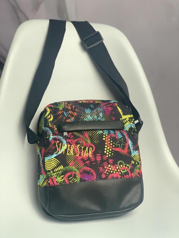 - розмір 24х 22х 7 см; -матеріал: Kiten + штучна шкіра. -Фірмова фурнітура. -Три відділення: Спереду на змійці; Центральне відділення на змійці зверху; Позаду на змійці. -Ремінь із можливістю регулювання по довжині. 1361328369