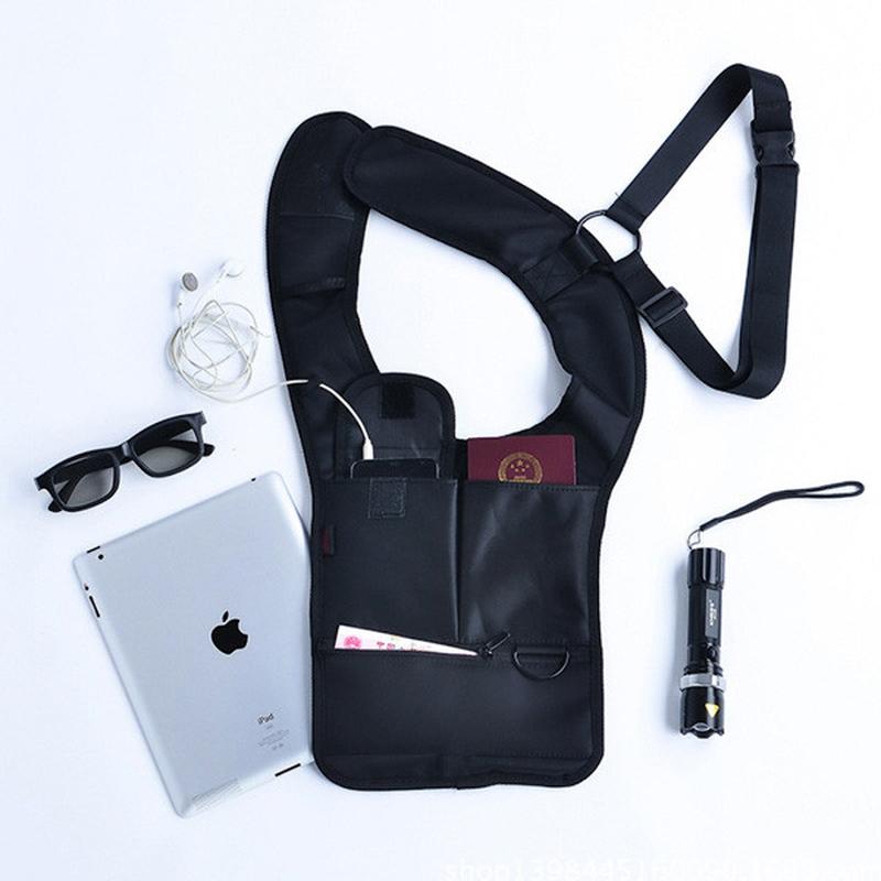 Наплечная сумка-кобура под мышку для скрытого ношения денег и документов (модель с внутренним карманом). Общая идея данной модели позаимствована у кобуры для ношения оружия. Главное ее преимущество – это максимально затрудненный доступ для всех, кроме владельца, а также неприметность под одеждой. Идеальный вариант для тех, кто предпочитает деловой стиль одежды. Все необходимые Вам вещи: телефон, ключи, документы, деньги и телефон, можно разместить в этой сумке, не перегружая при этом карманы брюк или пиджака. Сумка удобная и незаметна под одеждой. Модель с внутренним карманом. Выполнена из прочного нейлона, который имеет гладкую и приятную на ощупь поверхность, благодаря чему, не цепляется за одежду и очень легкая. На основной части сумочки находятся три кармана: один - на «липучке», второй - на «молнии» и третий - без застежки для быстрого доступа к содержимому. Также имеется металлическое полукольцо и текстильная петля для крепления ключей. Основной ремень широкий, имеет округлую форму и облегает плечо вокруг руки, дополнительная фиксация обеспечивается за счет регулируемого тонкого ремешка на пластиковой защелке. Скрытая сумка-кобура – отличный вариант для переноски ценных вещей – украсть их у владельца будет просто невозможно, причем ни тайным, ни нагло-явным образом! Максимальная длина ремешка с кольцом 93 см