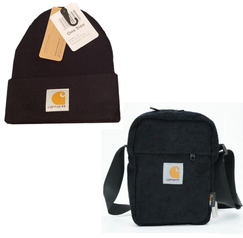 Комплект мужской. Сумка и шапка Carhartt [Кархартт]. Черный Теплая шапка Carhartt изготовлена из мягкой акриловой пряжи в рубчик и украшена логотипом бренда. Она отлично подойдет для повседневных городских образов и обеспечит максимум комфорта. - Пол: Унисекс - Материал: 100% акрил (мягкий и приятный на ощупь) - Цвет: Черный - Логотип: нашивка - Размер: оne size (55-59) Мессенджер Carhartt: - основное отделение и 2 дополнительных - водонепроницаемый материал
