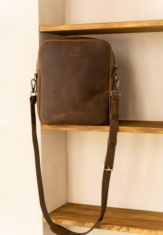 Розмір: 23х27,5 см Матеріал: шкіра Закривається на блискавку Всередині: одне відділення і кишеня на блискавці, кишеня на блискавці на зовнішній частині задньої стінки В комплекті знімна регульована шлея для носіння через плече Фурнітура: металева