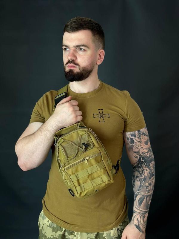 Сумка-слінг однолямкова через плече, тактичний рюкзак з кордури нагрудний олива Тактична сумка-слінг має один основний відділ та одну велику зовнішню кишеню на замку (18х18х5см). Обидва відділи мають отвори-люверси для вентиляції та відведення вологи. П'ять пластиккових кілець-кріплень дозволяють фіксувати ремінь з карабінами, відповідно до Ваших потреб, або ж за допомогою кільцевої кнопки просто трансформувати сумку в барсетку. Сумка має також коротку ручку. Система МОЛЛЕ дозволяє виконувати кріплення до бічних граней сумки, передньої частини зовнішньої кишені, а також, до клапана, що переходить в ремінь. Цей же клапан має: кишеню 10х14см з водонепрникного метеріалу (для ліхтарика, наприклад) резинку 9,5 см для кріплень Під час трансформації сумки-слінга в барсетку клапан зручно ховати в кишеню на задній частині сумки, яка виконана з тонкого паралону з сіткою для зручного контакту з тілом. Також, задня частина сумки-слінга має кріплення на липучці діаметром 4 см, або ж 6 см в натянутому замкненому стані. Верхня передня частина рюкзака має велкро-панель для кріплення шевронів чи будь-яких інших елементів на липучці. Поверх панелі-велкро навхрест натягнутий шнур-резинка з пружинним пластиковим фіксатором. Під велкро-панеллю є наскрізна кишеня. Основний відділ: пообидві стінки відділу має по одній внутрішні кишені з підкладочного матеріалу (глибина кишень 19 см і 20 см) Зовнішня кишеня: має одну внутрішню кишеню з підкладочного матеріалу (12 см на 11 см) та одну ззовні на замку. Ремінь: виконаний з ремінної стрічки (текстильна стропа) і має резинку- фіксатор, що не дає пряжці зісковзувати. Ширина - 4 см. Довжина - від 60 см до 110 см. Карабіни виконані з пластику та металу, пряжка - з пластику. Усередині сумки знаходиться: 1 основний відділ (з двома кишенями) на блискавці з двома бігунками; Ззовні і всередині зовнішньої кишені є по одній кишені; Кишеня-відділ на задній частині сумки; Невелика кишенька на частині, що переходить в ремінь; Замки-блискавки виконані з пластику, бігунки - металеві Розмір сумки: Висота - 30 см Довжина - 20 см Ширина - 15 см (основне відділення ~ 10 см + зовнішня кишеня - 5 см) Матеріал: кордура (водонепроникний міцний нейлон)