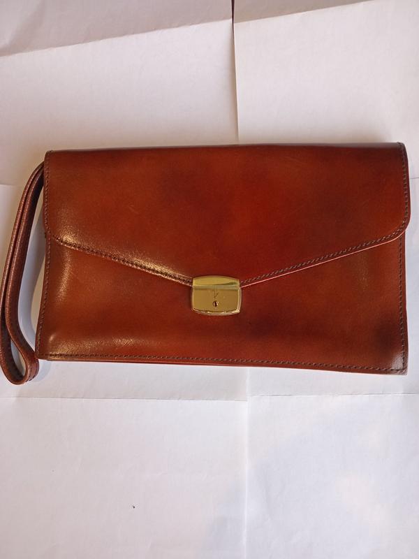 Натуральная кожа, отличное состояние, застежка на замке и на кнопках. Разклвдывается задняя часть и получается планшет в котором 4 больших отделения: 2 на молниях и 2 больших без застежки, 1 среднее и 2 маленьких. Спереди 2 больших отделения с застёжкой на замке. Короткая боковая ручка. Размеры: 25×15×5 см.