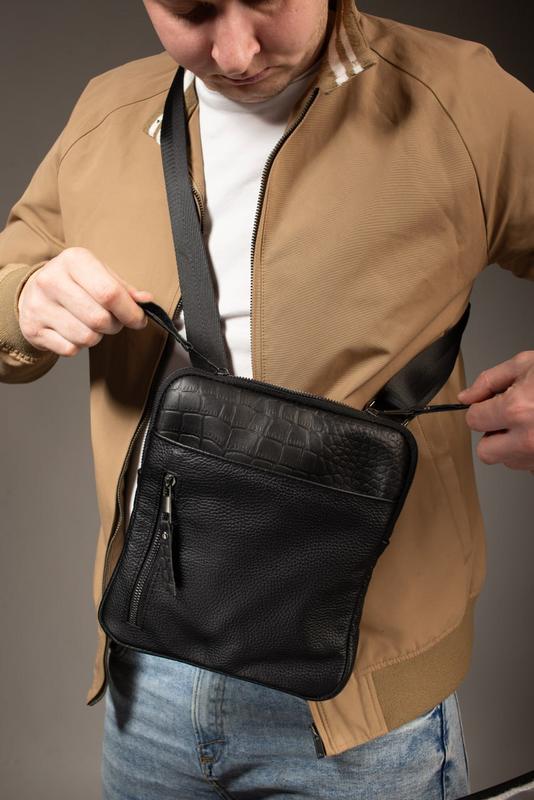 Артикул: SKL-040 - Материал: натуральная итальянская кожа КРС - Вставка: натуральная кожа с имитацией кожи крокодила - Вид кожи: зернистая - Тип модели: мессенджер - Цвет: черный - Фурнитура: металлическая - Регулируемый премиум ремешок 145см - Размер: (В*Ш*Г) – 26см *22см *2см *2см