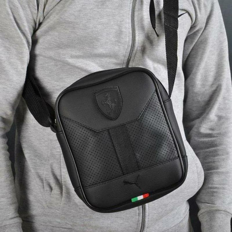Стильная сумка через плечо, борсетка Puma Ferrari, феррари пума. Черная • Характеристики: - Материал: Эко-кожа (Высокое качество, износостойкая) - перфорация - Материал подкладки: Нейлон (прочный) - Цвет черный - Цвет подкладки: черный - Застежка: Молния (Бегунки ЗАЛЕЗНИ) - Количество отделений - 2: (Основой + карман внутри) - Ремень с регулировкой длины (140 см) • Особенности товара: - прочная фурнитура - материал Эко-кожа (водостойкая, износостойкая) - Стиль unisex - Логотипы по использованию известных мировых брендов, таких как Puma, Ferrari - Размер: Длина - 24см, Ширина - 18см., Глубина - 6см. (под стандартный тетрадь или блокнот) Качественная, прослужит вам долго.