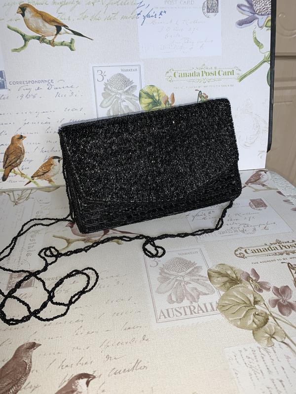 Дуже красивий, бісер красиво виблискує при певному освітленні. Є декілька маленьких недолік - не вистачає бісеринок, але це легко виправити. Розміри 21*13*4 довжина ручки 1 метр.