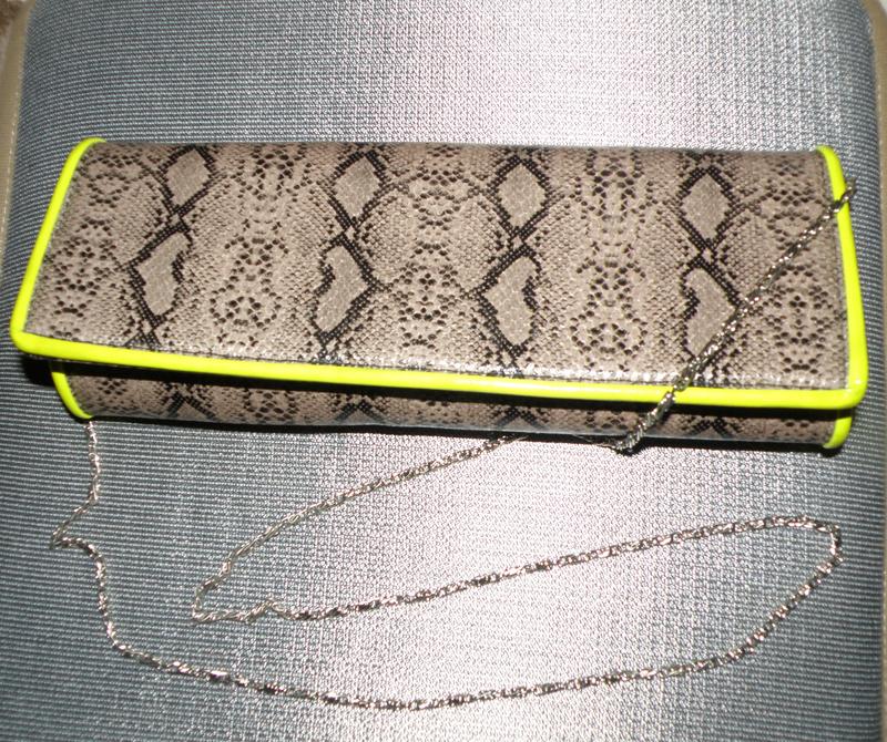 сумочка-клатч на ручке-цепочке, которую можно отстегнуть расцветки под рептилию, застёгивается на кнопку, не кожа замеры: 27х11 ручка 118см