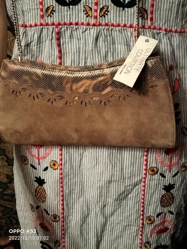 Клатч на ланцюжку,колір шоколад новий,,одна сторона замш,інша структура шкіри зміїний принт.