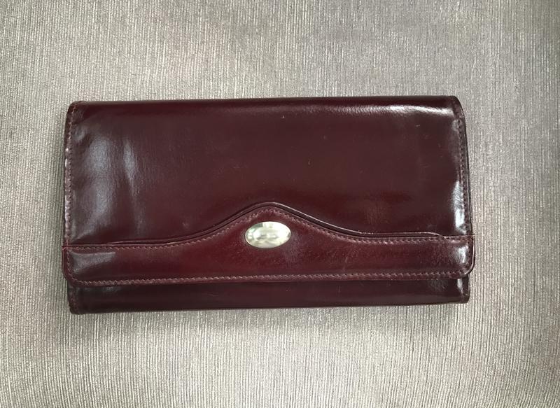 Кожаный клатч бордового цвета Состояние 4- Есть 2 зацепки ( фото 3 ) Подкладка целая, чистая, но есть пятно, видно на последнем фото. В остальном без повреждений.