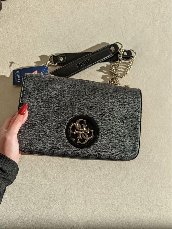 Сумочка Guess клатч с массивной цепочкой - моногам ❤️ КОД: черный 20257-1 коричневый 20257-2 черный стеганный 20257-3 серый 20257-4 Размер: 22 х 16 х 7 см Материал - «Эко» кожа Одно коллообразное отделение на магнитах, в середине дополнительно мини карман с логотипом, на белье. Вся фурнитура брендируется, очень качественная массивная. Подкладка брендируется. Длина ремешка - 120 см.