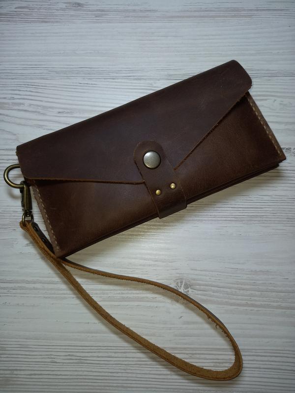 Цвет - "Табак"; Материал: натуральная кожа; Размер: 21х11 см в сложенном виде; 4 отдела для карт; 2 отдела для бумаг и банкнот; 1 отдел для монет на молнии; Ручка-петля из кожи; Hand crafted