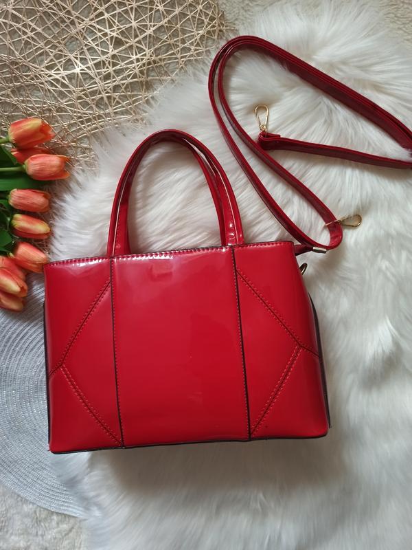 сумка лакована в наборе есть длинный ремешок состояние идеал ширина 30 см, длина 20 см, сбоку 8 см, есть два отделения, и вишенки три, два в середине, один сбоку