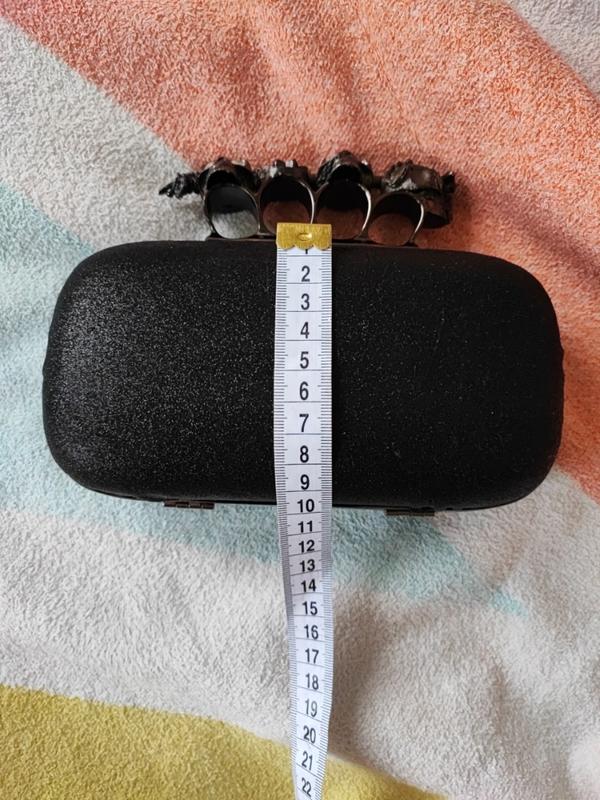 Вечерний клатч с кольцами на съемной цепочке(потеряна, в цене учтено). Бунтарский вид с черепами и стразами. Такой стильный и модный аксессуар как клатч должен присутствовать в гардеробе каждой современной девушки. Он отлично подойдет для вечернего выхода или прогулок по городу. Такая мини-сумочка хорошо вмещает все необходимые предметы первой необходимости для дам, это – помада, зеркальце, пудра, мобильный телефон и прочее. Состояние идеальное. Подкладка в идеальном состоянии.