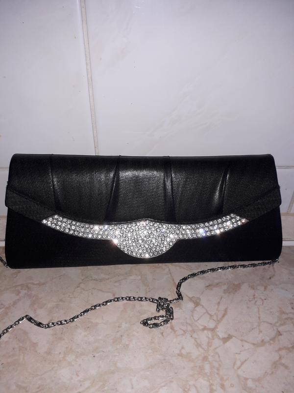 Дуже гарний жіночий клатч чорного кольору, ручка з цепочки.Клатч з блискучої тканини, м'який, в середині одне відділення і карманчик.Стан ідеальний, практично новий використовувався лише один раз. Ширина по низу 26 см., по аерху 23 си. Висота 10 см. Ширина боку 3 см.