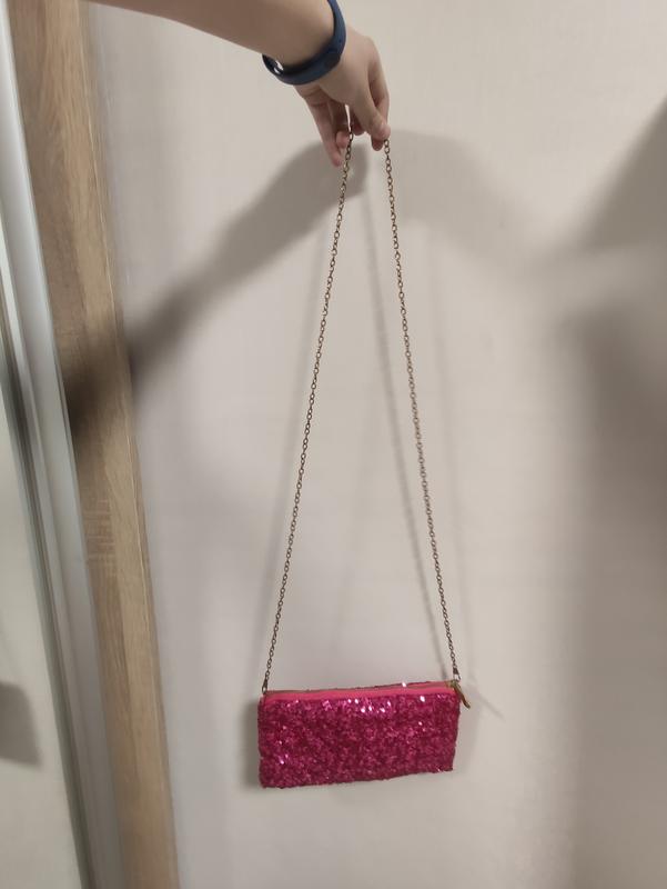 яскраво-рожевого кольору з паєтками. ланцюжок відкріплюється, а всередині є кишенька. ланцюг і бігунок потерті, на останньому фото, але це мало помітно. сумочка родом з українського Криму :)