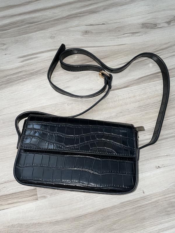 Черная сумочка на плечо с тиснением под крокодил. Размер 22х13 см.