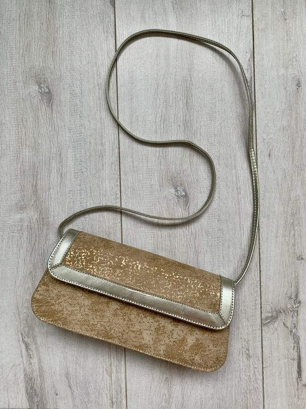 Сумка как новая, без дефектов. Имеет цветное напыление, переливающееся на свету. Длина сумки 26 см, высота 13 см, ширина дна 6 см. Длина ручки (половина) 56 см.
