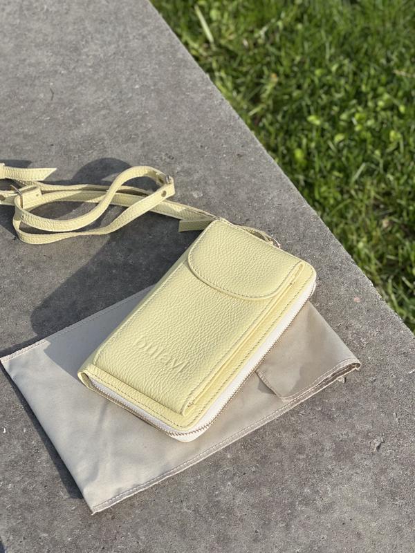 Клатч - кошелек из натуральной кожи. Размер 20х13. Ручка длинная, земная, регулирующая. В середине отделы для карт, монет, купюр, а также можно поместить заграничный паспорт Внешний карман для телефона Невероятно удобный Также присутствует в наличии: белый, молочный, карарамель, лимон, черный матовый, черный + коралл, васильковый.