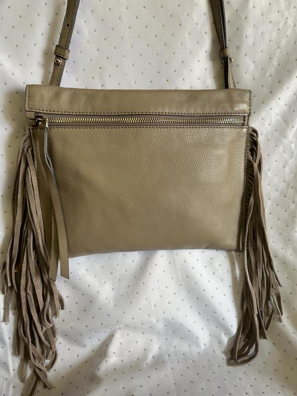 Серо-бежевая сумочка с бахромой из мягкой, качественной кожи. Подкладка натуральная. Индия. TheBag .Состояние отличное, без нюансов. На одно отделение с боковым карманом на молнии. Р-р 21 на 26,5 см, ручка до 120 см, немного регулируется.