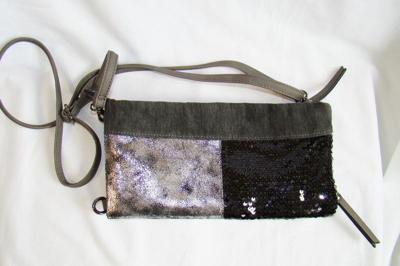 Сумка клатч Emily & Noah Изготовлен из комбинированного материала - эко-кожа, текстиль, материал с паетками (паетки-перевертыши, поворачиваются вверх и вниз). Одно большое отделение на молнии, внутри карман на молнии для мелочей. С внутренней стороны карман на молнии. Можно носить сложенную как клатч или как сумку. Длина 28 см, высота клатча 15 см, в разложенном состоянии 30 см. Длина ремешка 150 см. Цена 490 грн.