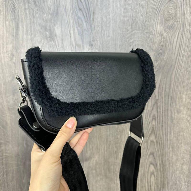 Матеріал: якісна та щільна екошкіра, добре тримає форму + натуральне хутро; Довжина: 19 см; Ширина на основі: 4 см; Висота: 14 см; Плечовий ремінь – у комплекті; Код: 1397