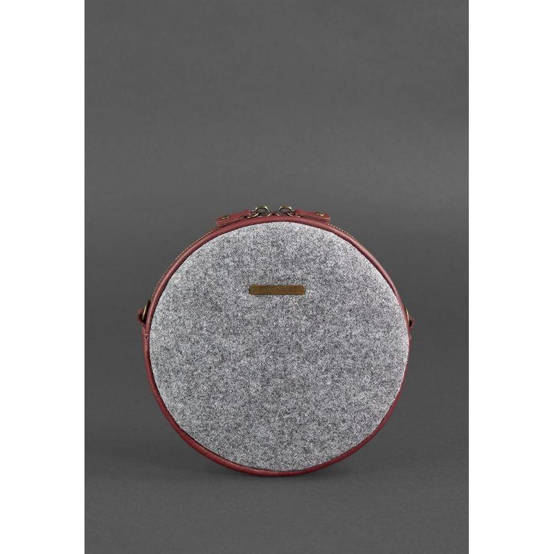 Круглая фетровая женская сумка таблетка с кожаными бордовыми вставками