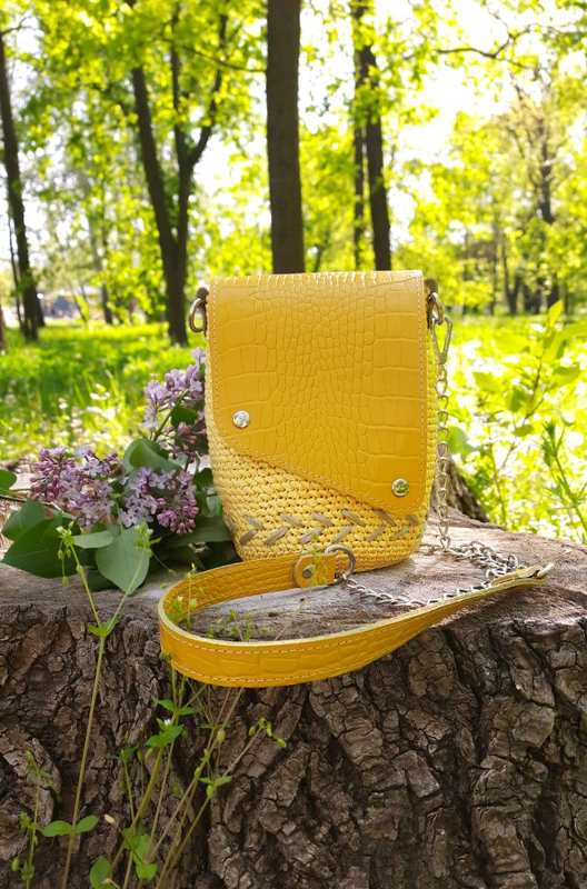 Тип сумки: Через плече Торг Сумка зв'язана гачком із рафії. Оздоблена клапаном та денцем 10 см із натуральної шкіри, має довгий клмбінований ремінець. Виглядає дуже ефектно. Розмір 20х13 см.