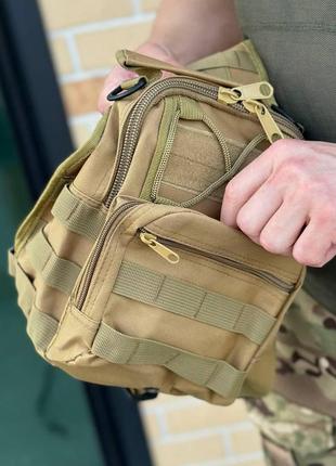 Кілька примірників у наявності Сумка-слінг однолямкова через плече, тактичний рюкзак з кордури нагрудний олива Тактична сумка-слінг має один основний відділ та одну велику зовнішню кишеню на замку (18х18х5см). Обидва відділи мають отвори-люверси для вентиляції та відведення вологи. П'ять пластиккових кілець-кріплень дозволяють фіксувати ремінь з карабінами, відповідно до Ваших потреб, або ж за допомогою кільцевої кнопки просто трансформувати сумку в барсетку. Сумка має також коротку ручку. Система МОЛЛЕ дозволяє виконувати кріплення до бічних граней сумки, передньої частини зовнішньої кишені, а також, до клапана, що переходить в ремінь. Цей же клапан має: кишеню 10х14см з водонепрникного метеріалу (для ліхтарика, наприклад) резинку 9,5 см для кріплень Під час трансформації сумки-слінга в барсетку клапан зручно ховати в кишеню на задній частині сумки, яка виконана з тонкого паралону з сіткою для зручного контакту з тілом. Також, задня частина сумки-слінга має кріплення на липучці діаметром 4 см, або ж 6 см в натянутому замкненому стані. Верхня передня частина рюкзака має велкро-панель для кріплення шевронів чи будь-яких інших елементів на липучці. Поверх панелі-велкро навхрест натягнутий шнур-резинка з пружинним пластиковим фіксатором. Під велкро-панеллю є наскрізна кишеня. Основний відділ: пообидві стінки відділу має по одній внутрішні кишені з підкладочного матеріалу (глибина кишень 19 см і 20 см) Зовнішня кишеня: має одну внутрішню кишеню з підкладочного матеріалу (12 см на 11 см) та одну ззовні на замку. Ремінь: виконаний з ремінної стрічки (текстильна стропа) і має резинку- фіксатор, що не дає пряжці зісковзувати. Ширина - 4 см. Довжина - від 60 см до 110 см. Карабіни виконані з пластику та металу, пряжка - з пластику. Усередині сумки знаходиться: 1 основний відділ (з двома кишенями) на блискавці з двома бігунками; Ззовні і всередині зовнішньої кишені є по одній кишені; Кишеня-відділ на задній частині сумки; Невелика кишенька на частині, що переходить в ремінь; Замки-блискавки виконані з пластику, бігунки - металеві Розмір сумки: Висота - 30 см Довжина - 20 см Ширина - 15 см (основне відділення ~ 10 см + зовнішня кишеня - 5 см) Матеріал: кордура (водонепроникний міцний нейлон) Розмір: койот