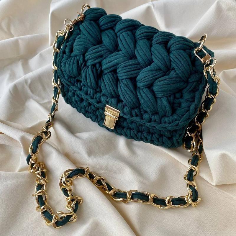 Сумочка ручной работы из трикотажной пряжи. Нереально красивого цвета. На прочном металлическом замочке. Размер сумки: высота 16, ширина 21, глубина 6. Дополнительные характеристики: Цвет : Зеленый Материал : Трикотажная пряжа
