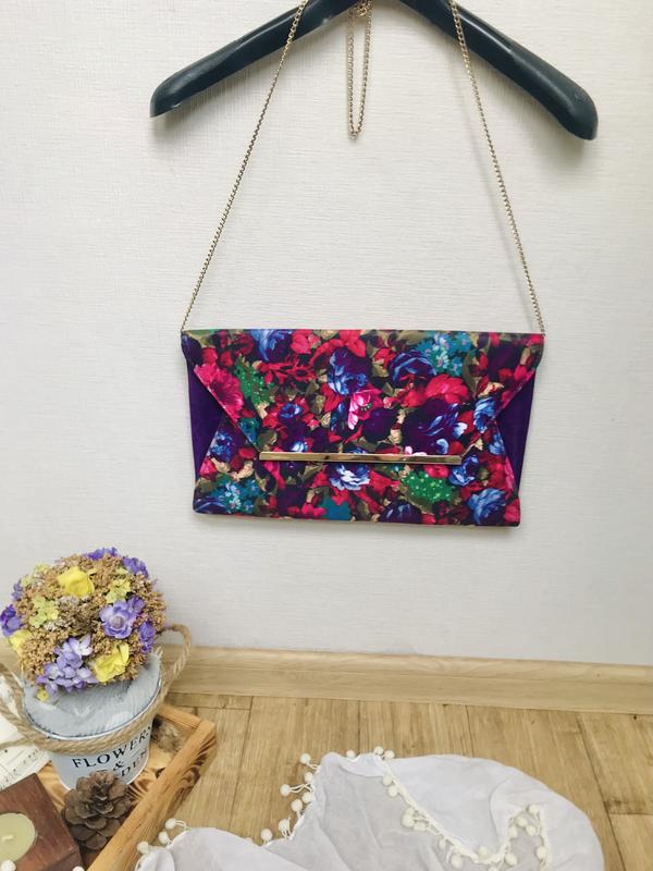 Клатч сумочка New Look цветочный принт на цепочке Материал -гладкий текстиль, экозамш. Размер 34*21 см, глубина 1 см и больше. Застёгивается на магнитную кнопку. Состояние отличное, без дефектов.