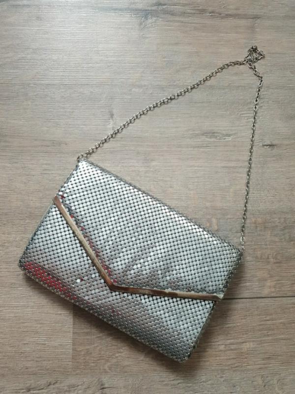 Сріблястий металевий клатч, 2 відділення + 2 маленькі кармани, ручка ланцюг, стан зверху майже ідеальний, в середині є сліди носіння, розмір 16х25 см