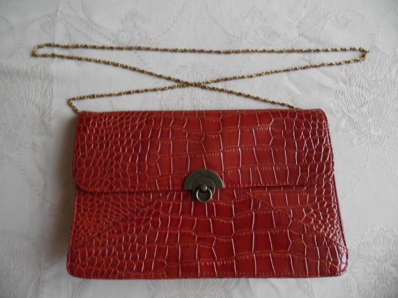 Сумочка клатч лаковая. Состояние отличное - все целое, без царапин, потертостей Сумка из лаковой «крокодильей» эко-кожи . Цвет рыжий, красно-коричневый Сумочка застегивается на мет.застежку. Внутри сумочка имеет одно отделение, и кармашек на молнии. Сумка имеет ручку из цепи длиной 105 см, высота цепи-ремешка – 55 см. Размеры сумочки: длина – 27 см высота – 17 см Глубина (ширина боковины) – 6 см. ПОДАРОК - при заказе от 850 грн