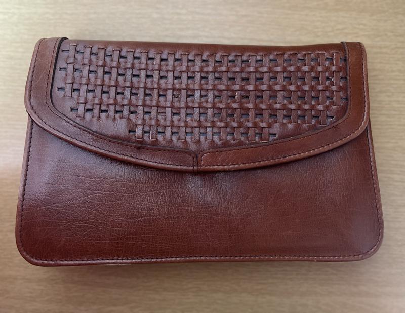Клатч шкіряний, плетений , підкладка замшева. Без ремінця. Один основний відділ і маленький на блискавці