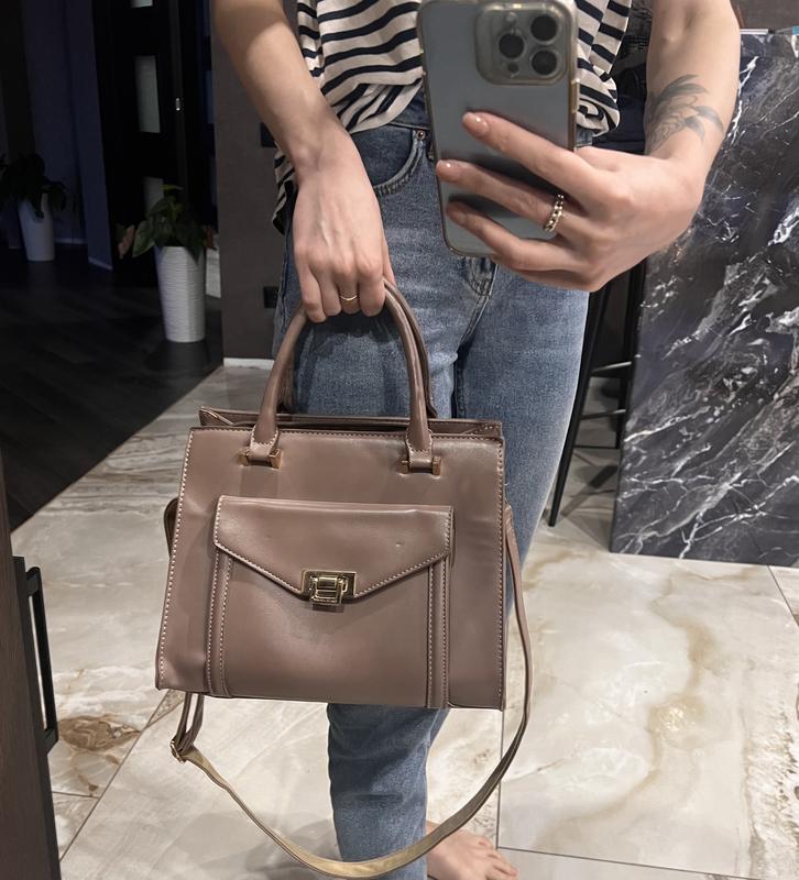 Класична сумка трапеція, каркасна. Розміри 30*23*10. Два відділення + зовнішній карманчик. Є дефекти на ручці та на одному з куточків сумки (2 останні фото)
