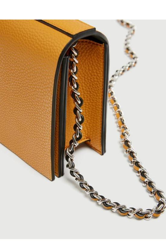 Желтая сумка с плечевым ремешком- ремень-цепочкой и магнитной застежкой. Висота x ширина x глубина: 12,5 x 18,5 x 5,5 см. Полиуретан.