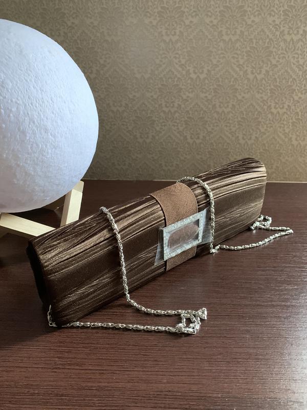 Содержание клатч шоколадного цвета с металлической цепочкой.