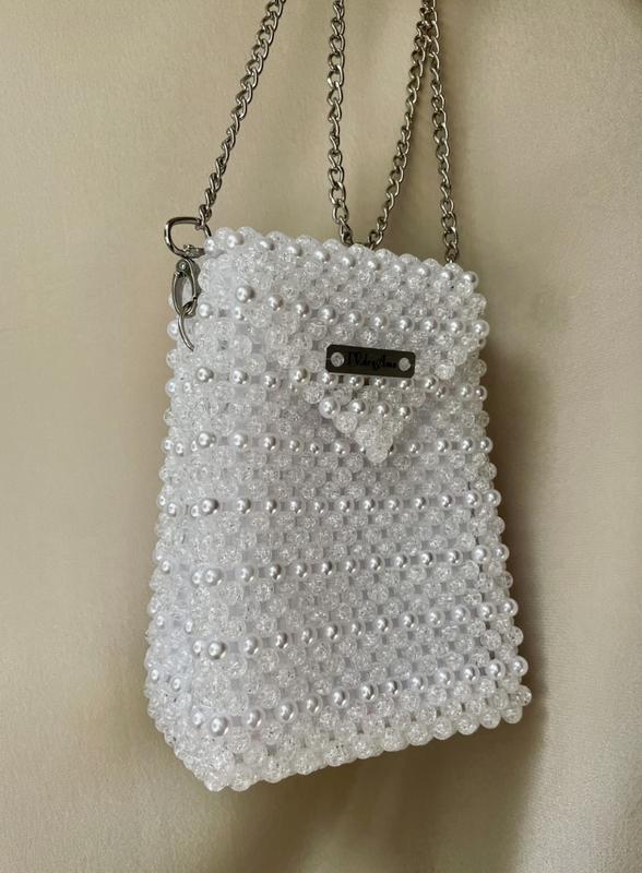 Продам красивую новую белую сумочку из бисера на магните. Вмещает телефон (айфон Про Макс):высота 17см- ширина 8см - длина 12-13 см, имеет подкладку.