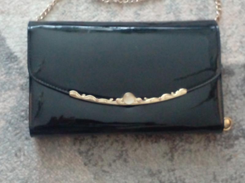 Жіноча сумочка - клатч , лакова , чорного кольору шлийка- ланцок. В середині три відліли , середній закривається на замок усередині два відділи у двох інших відділаз є кармани.Ширина 27см, висота 16см., стан нової.