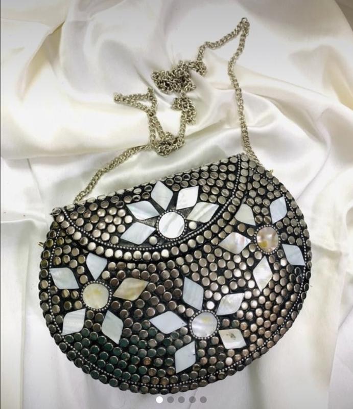 Клатч в серебристо-белом цвете Этот мозаичный металлический клатч-полумесяц с отделкой камнем имеет одно основное отделение с застежкой на клапан и металлическую цепочку, которая снимается. Размер 20:6:16