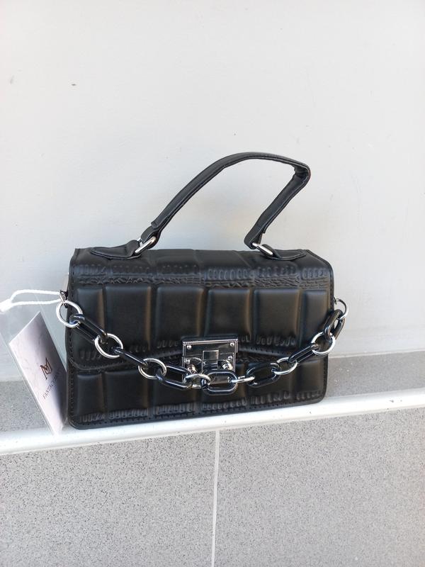 Сумка женская Цвет черный Материал экокожа Цепочка снимается Есть короткая ручка, и плечевой ремешок (регулируется) Внутри 2 отделения с перегородкой (карманом) Замеры Высота 14 см Ширина 21 см Глубина 9 см